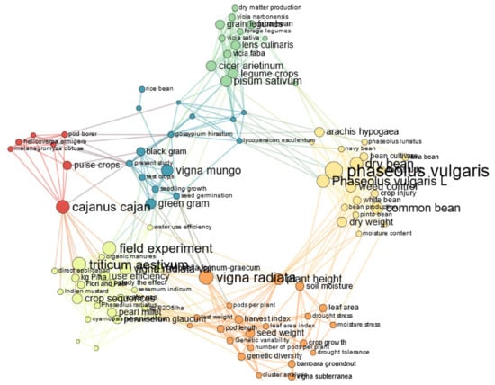 The most cited terms were Phaseolus vulgaris (in different written forms) with 537 occurrences which corresponded to more than 25% of all the literature, followed by Vigna radiata 407, Cajanus Cajan 238, Experimental field 155, Triticum aestivum 152, Vigna mungo 142, Common bean 95, Pisum sativum 70 and Arachis hypogaea 69. This confirms the large disparity that exists between main pulses and minor pulses in the literature. Those terms are also entered into evidence on the network map of the 100 most cited terms in the abstract (Figure 2). We can also identify other terms associated with the yield (height of the plant, seeds dry weight or leaf area), management practices (P fertilization) associated with the impact on other crops (like wheat or mustard) or on the pulse studied and resistance to biotic or abiotic stresses (drought, moisture, weeds, diseases and insects).