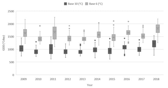 Bow whispers of the growing degrees days (GDD, °C day) cumulative distributions in several locations in European temperate regions (see Section 2.4) within the last 10 studied years for a base temperature of 6 and 10 °C (source: own calculation from the Agri4cast database).
