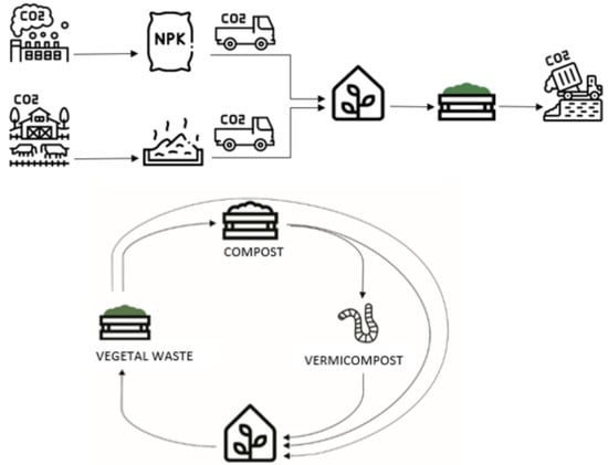 Using vegetal waste generated within the same production site as a source of crop nutrients must be considered as an advantage for the farmer, as it allows a reduction in the use of external fertilisers [4,9], while decreasing transport and waste management costs. Furthermore, organic fertilisation has a fundamental role in improving soil structure and fertility [10], enhancing chemical, physical and biological soil properties [11] and increasing soil C sequestration [12]. Vegetal waste can be incorporated into the soil directly as fresh residues but considering the high amount of residues generated for each crop cycle, processes of composting or vermicomposting should be considered in order to improve the organic matter’s nutritional characteristics and to stabilise the biomass (Figure 1).