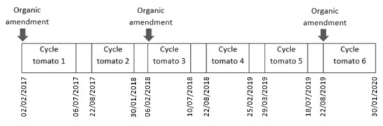 Tomatoes (Solanum lycopersicum L.) cv. ‘Surcal’ (Natursur S.C.A.), grafted onto Beaufort (Monsanto) rootstock, were transplanted on 22 August 2019, in an area of 650 m2, with a density of 0.66 plants m−2, staked and growing with two stems. Pollination was carried out by bumblebee; pest control was conducted following the integrated production standards. Before the experiment, the greenhouse had previously been cropped with 5 cycles of tomatoes over 3 years. The organic plots were managed with the same amendments as in the presented study. Amendments were applied to the organic plots in February 2017, February 2018 before transplanting, and the last application was made in August 2019 before starting the crop cycle examined in this experiment (Figure 2). The basic chemical properties of the soil are presented in Table 1.