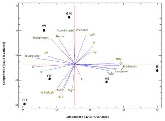 PCA (Figure 3) was carried out including all the variables presented previously: yield (kg m−2) (Table 3), quality parameters (Table 4 and Table 5) and soil chemical analysis (Table 6). The variables that did not show a strong influence on the model were removed from the analysis. After eliminating the non-representative variables, the two first principal components explained 32.61% and 38.33%, respectively, of the total variance.