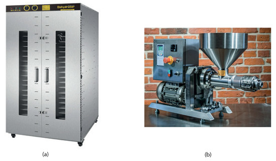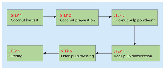 - Nock pulp dehydration: the powdered coconut is placed in the dehydrator (Figure 8a). The dehydration process takes approximately 12 h at a temperature of approximately 58 C. The dehydrator capacity is approximately 100 kg and the energy consumption is approximately 5850 Wh;