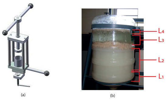 Figure 7. Coconut fermentation-based oil extraction process: coconut milk extraction machine (a) and coconut milk fermentation container (b). - Fermentation: the extracted milk is stirred vigorously for a few minutes and placed, for the fermentation process, in a transparent container, where it will rest for 24/36 h (Figure 7b). Under favorable conditions of temperature and relative humidity, the fermentation process gives rise to high quality coconut oil. The fermentation procedure efficiency is approximately 20–22% of the weight of the coconut pulp. If the operating and sanitary conditions are correct and precautions are strictly followed, four distinct layers will form in the fermentation container (Figure 7b). The bottom () consists of a rubbery sediment. The next layer () is watery and contains fermented skim milk, which is not good for human consumption. The next level () is the oil to be filtered. The floating top layer () is the curd. By carefully removing the distinct layers, the oil can be separated;