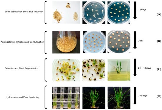 The stepwise Agrobacterium-mediated rice transformation and regeneration. (A) Dehusked seeds were surface-sterilized before callus induction on callus induction media. (B) Calli were Agro-infected and co-cultivated with Agrobacterium tumefaciens. (C) The selection of transformed calli on hygromycin selection and their regeneration for shoot and root development. (D) Plantlets were grown hydroponically before hardening in soil, and subsequently grown till maturity.