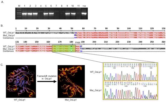 Expression analyses of rice bran Lip genes revealed that OsLip1 (LOC_Os11g43510) is the predominantly expressed gene during the onset of lipid mobilization [25]. In this study, we targeted the OsLip1 gene in order to validate the transformation protocol. We randomly picked 10 putative transformants for DNA extraction and PCR amplification of the Cas9 gene. Out of the 10 plants, 7 were observed to be positively transformed, as determined through the amplification of a ~1000 bp DNA fragment corresponding to the Cas9 gene (Figure 2A). The genomic integration of Cas9 is an indication of the possible gene editing of the target gene, OsLip1. In order to determine the genome editing events, we amplified and sequenced the target region using OsLip1-specific primers, flanking the PAM sequence using genomic DNA (Supplementary Table S1). The sequence obtained from the transgenic plants was then aligned to the wild-type sequence to identify any indels or substitutions. In one of the representative transgenic plants shown here (Figure 2B), we found a deletion of an adenosine (A) 4bp upstream of the PAM sequence. The sequencing chromatogram confirms the deletion of adenosine, as it exhibits two sharp peaks of Thymine (T) and no indication of adenosine at the DNA double-strand break site (Figure 2B). In order to check whether the deletion of a single base disrupts the protein structure, the mutated OsLip1 sequence was translated in silico. The single adenosine base deletion in the coding sequence of OsLip1 leads to a frameshift mutation of the protein structure. Furthermore, the protein structures were predicted, and models were generated for the wild-type and mutated OsLip1 proteins using Swiss-Model (https://swissmodel.expasy.org/, assessed on 25 October 2021). The predicted structures showed complete disruption of Lip structure in the mutated OsLip1 protein (Figure 2C).