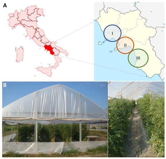 Details of collecting and cultivation site for the ‘San Marzano’ and ‘Re Fiascone’ landraces. (A) The Campania region with three major districts: Napoli (I), Agro Sarnese-Nocerino (II) and Piana Del Sele (III). (B) Details of cultivation at the experimental farm of the Research Centre for Vegetable and Ornamental Crops located in Pontecagnano (SA).
