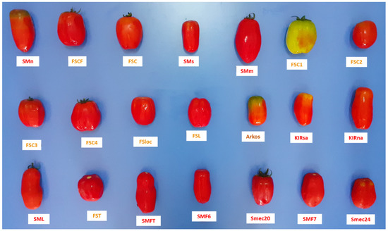 In the Southern part of Italy, the Campania region represents an important basin for tomato production with a long tradition of selection of local varieties developed according to farmer preferences and adaptation to local edaphic and climatic conditions. Among these, ‘Pomodoro S. Marzano dell’Agro Sarnese-Nocerino’ received the PDO—Protected Designations of Origin (area of cultivation Avellino, Napoli and Salerno in the Campania region) under European Union law namely [4]. This long-shaped landrace is among the most appreciated commodity for its taste, flavour, and aptitude for industrial processing. The unicity of the cultivar is given by a combination of factors, including the fertile soil of volcanic origin and the skills of producers in the production area [4,5]. ‘San Marzano’ was a leading product for the canning industry for tomato peeled sauce, being marketed on the national territory, and exported to numerous countries of Europe and the Americas since the beginning of the twentieth century [6]. Although different accessions have been maintained and handed down over the years by farmers, the cultivation of these tomatoes has significantly reduced due to emerging of viral diseases but also the establishment of high-yielding hybrids better fitting the needs of intensive farming (e.g., adaptable to mechanical harvesting) [7,8].