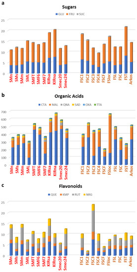 Stacked bars indicating the total amount of sugars (a), organic acids (b) and flavonoids (c) for eleven ‘San Marzano’ (red font) and ten ‘Re Fiascone’ (orange font) accessions. On the Y axis, (a) sugars (mg g−1 FW); (b) organic acids (mg 100 g−1 FW); (c) flavonoids (mg Q3G 100 g−1 FW).