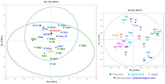 The PCA in the first two dimensions, for the morphological, chemical and biochemical traits, revealed 36.21% of the total variance (Figure 4). Accessions of the two cultivar groups and traits were evenly distributed in both negative and positive axes of the graph. The first component which explained the 19.16% of the total variance was positively correlated with morphological traits except FS, flavonoids, soluble solids and total acidity, and negatively correlated with sugars, organic acids except oxalic acid, β-carotene, trans-lycopene and ascorbic acid. The second component which explained the 17.05% of the total variance was positively correlated with all flavonoids, trans-lycopene, β-carotene and most organic acids and negatively correlated with sugars and ascorbic acid. Morpho-agronomic and chemical traits were interspersed in both the negative and positive parts of the second component. ‘San Marzano’ accessions tended to cluster mostly in the positive axis of PC2 except for SML and SMF7. On the contrary, ‘Re Fiascone’ genotypes were mostly in the negative part of PC2 apart from ‘Arkos’ and ‘FSloc’. Overall, ‘Re Fiascone’ cultivars showed the highest variability for the traits considered.
