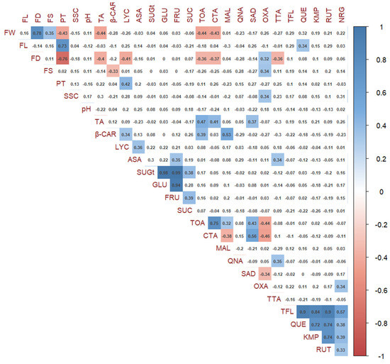 Rutins and citric acid were the main factors discriminating the genotypes under study accounting for 13.38% and 12.86% of the total variation of the first and second component, respectively (Table S5). Significant correlation between pairs of variables mostly occurred among the same group of traits (Figure 5). Between morphological, chemical and biochemical traits, we found negative correlation of fruit weight with total acidity and among organic acids, citric acid and positive correlation of pericarp thickness with trans-lycopene. β-carotene was positively correlated with malic acid and trans-lycopene. Ascorbic acid was positively correlated with fructose and tartaric acid. Total acidity was highly correlated with positive sign with citric and succinic acid whereas, for the other organic acids the correlation was very weak.
