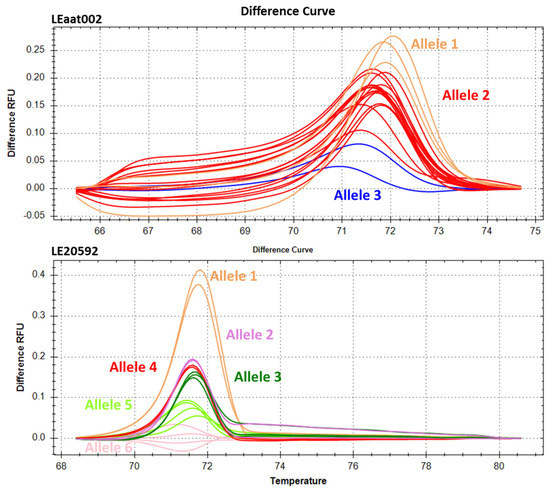 For genetic diversity analysis 10 microsatellites comprising various repeat classes were selected for their ability to generate polymorphism based on previous information (Table 1) [11,19,20]. Considering the SSR fragment analysis by capillary electrophoresis (CE-SSR), we detected 36 alleles for an average of 3.6 alleles per locus (Table 3). The number of alleles at each locus varied from two for LE21085 to seven for LEta015. Only the marker TCI C-419 was monomorphic. Among the 10 SSR used, the mean PIC was 0.33, with values ranging from 0.20 for LE20592 to 0.50 for LEtat002. EMR ranged from two for LE21085 to seven for Leta015. MI ranged from 0.27 for LEta015 to 3.11 for LEaat002. RP ranged from 0.22 for LE20592 to 1.86 for LE21085. Considering the SSR analysis by HRM (HRM-SSR) we detected similar number of total alleles based on melting profiles being 37 for an average of 3.7 alleles per locus (Table 4).
