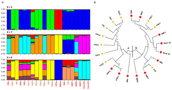 Genetic diversity of the collection studied based on polymorphisms detected with both capillary electrophoresis and high resolution melting using ten microsatellite markers. (a) STRUCTURE analysis of three (K = 3), seven (K = 7) and nine (K = 9) cluster. The vertical bars indicate the membership coefficient for each individual. Coloured blocks correspond to the different clusters. (b) Circular diagram showing maximum likelihood-based phylogenetic analysis based on Tamura-Nei model.