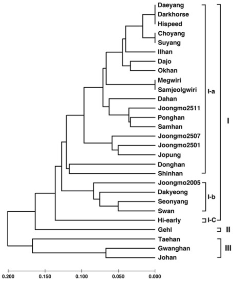 - Liu, K.; Muse, S.V. PowerMarker: An integrated analysis environment for genetic marker analysis. Bioinformatics 2005, 21, 2128–2129. [Google Scholar] [CrossRef] [PubMed]