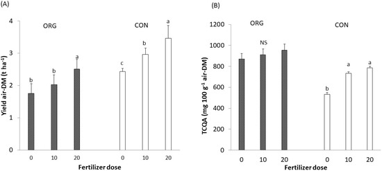 (A) Yield of air-dry biomass and (B) Content of total caffeoylquinic acids based (TCQA) based on the combination of organic (ORG)/conventional (CON) cropping system × fertilizer dose interaction.10 N; 20:20 N nitrogen dose expressed in kg ha−1. Different letters (a–c) are significantly different for each separate cropping system (ORG and CON) between the three fertilizer doses (p ≤ 0.05). NS means not significant. Bars indicate ± standard deviation.