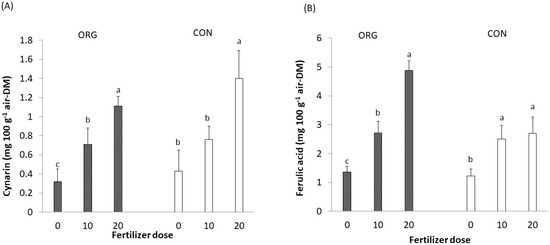 (A) Cynarin content and (B) Ferulic acid content based on the combination of organic (ORG)/conventional (CON) cropping system × fertilizer dose interaction. 0:0 N; 10:10 N; 20:20 N nitrogen dose expressed in kg ha−1. Different letters (a–c) are significantly different for each separate cropping system (ORG and CON) between the three fertilizer doses (p ≤ 0.05). Bars indicate ± standard deviation.