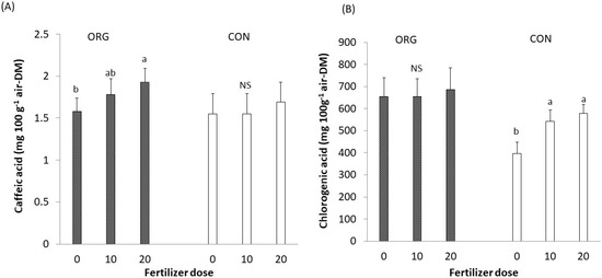 Caffeic acid was also another variable affected by N fertilization because it was significantly boosted by 22% in the ORG cropping system (20 kg ha−1 dose). In CON management, the differences between fertilizer treatments were insignificant (Figure 3).