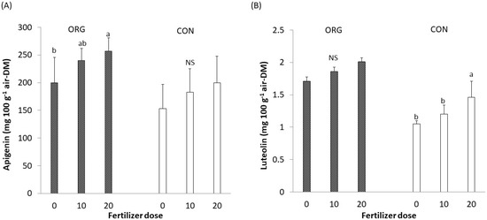 (A) Apigenin content and (B) Luteolin content based on the combination of organic (ORG)/conventional (CON) cropping system × fertilizer dose interaction. 0:0 N; 10:10 N; 20:20 N nitrogen dose expressed in kg ha−1. Different letters (a–c) are significantly different for each separate cropping system (ORG and CON) between the three fertilizer doses (p ≤ 0.05). NS means not significant. Bars indicate ± standard deviation.