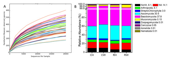 Rarefaction curves of individual samples (A) and relative abundances of phyla (B) associated with oil palm roots. CH = conventional fertilization and herbicide treatment, CW = conventional fertilization and weeding, RH = reduced fertilization and herbicide treatment, RW = reduced fertilization and weeding. Phyla with sequence abundances ≥0.01% were included. Numbers next to phylum name indicate means (%) across all samples with 100% = 240,000 reads per treatment. NoHit = read had no match in the database, NA = reads were not assigned to any phylum. Please note that owing to primers bias, the relative abundance of a phylum cannot be compared across the phyla, but only among the treatments.