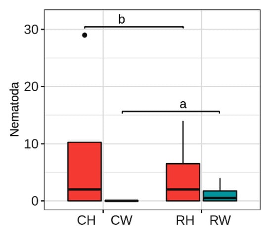 Species richness of nematodes associated with oil palm roots. CW = conventional fertilization and weeding, RH = reduced fertilization and herbicide treatment, RW = reduced fertilization and weeding. Species richness in four plots per treatment with three replicate samples per plot. Data show boxplots (20% to 80%, horizontal line = mean). Different letters above the boxes indicate significant treatment effects at Chi2 < 0.05.
