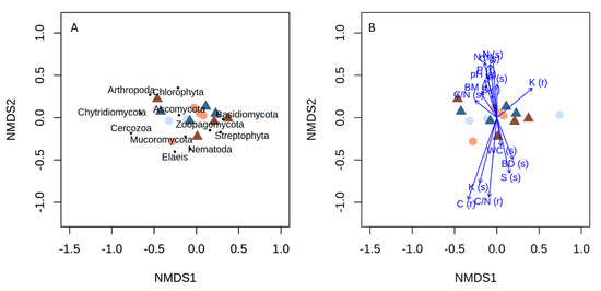 NMDS of phyla (A) and potential environmental drivers (B) associated with oil palm roots. Conventional fertilization and herbicide treatment = light blue circle, Conventional fertilization and weeding = pink circle, reduced fertilization and herbicide treatment = dark blue triangle, reduced fertilization and weeding = brown triangle. Stress(nMDS phyla) = 0.051. Lengths of the vectors in (B) are proportional to the correlation between ordination and environmental variable. Vectors with p < 0.1 are shown.