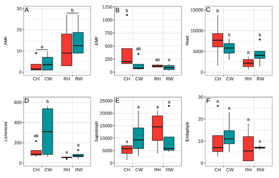 Species richness of fungal guilds associated with oil palm roots. (A): Arbuscular mycorrhizal fungi, (B): Multiguild fungi with ectomycorrhizal potential; (C): yeasts; (D): lichenized fungi; (E): saprotrophic fungi; (F): endophytic fungi. CW = conventional fertilization and weeding, RH = reduced fertilization and herbicide treatment, RW = reduced fertilization and weeding. Species richness in four plots per treatment with three replicate samples per plot. Data show boxplots (20% to 80%, horizontal line = mean). Different letters above the boxes indicate significant treatment effects at Chi2 < 0.05.