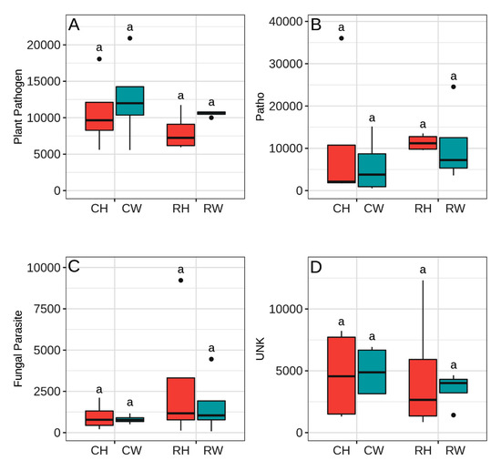Species richness of root-associated fungal guilds with potentially negative or unclear effects on oil palms. (A): Plant pathogenic fungi; (B): path = other potentially pathogenic fungi, (C): fungal parasitic fungi; (D): UNK = fungi with unknown lifestyle. CW = conventional fertilization and weeding, RH = reduced fertilization and herbicide treatment, RW = reduced fertilization and weeding. Species richness in four plots per treatment with three replicate samples per plot. Data show boxplots (20% to 80%, horizontal line = mean). Different letters above the boxes indicate significant treatment effects at Chi2 < 0.05.