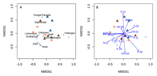 NMDS of fungal guilds (A) and potential environmental drivers (B). Conventional fertilization and herbicide treatment = light blue circle, Conventional fertilization and weeding = pink circle, reduced fertilization and herbicide treatment = dark blue triangle, reduced fertilization and weeding = brown triangle. Stress(guild) = 0.117. Length of vectors (B) is proportional to the correlation between ordination and environmental variable. Vectors with p < 0.1 are shown.