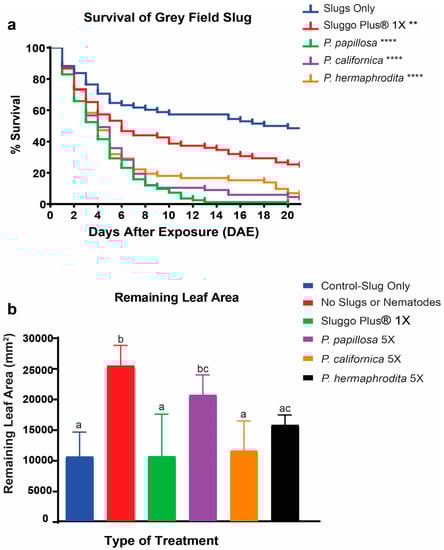 (a) Percentage survival of Deroceras reticulatum exposed to three species of Phasmarhabditis (P. californica, P. hermaphrodita and P. papillosa), compared with Sluggo Plus® (iron phosphate and spinosad). P. papillosa caused an average of 97.5% mortality (SEM = 0.01), P. hermaphrodita caused an average of 81.4% mortality (SEM = 0.09), P. californica caused an average of 77.2% mortality (SEM = 0.05), Sluggo Plus® caused an average of 68.6% mortality (SEM = 0.05), and the slug only control had an average of 41.9% mortality (SEM = 0.06). ** indicates a p value of < 0.01 and **** indicates a p value < 0.0001 compared to the slug only control (b). Average remaining leaf area (mm2) of Canna ‘Cannova® Bronze Scarlet Canna Lily’ after 21 days after exposure (DAE) to Phasmarhabditis treatment, compared with Sluggo Plus® treatment and controls. Picture was taken 21 DAE in trial 1 of the lath house experiment. Shared letters indicate the absence of significant differences whereas treatments not sharing letters significantly differ from one another. Log rank analyses were used, comparing each treatment to one another in panel A. A one-way ANOVA utilizing Tukey’s multiple comparisons test was used for panel B.