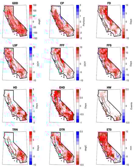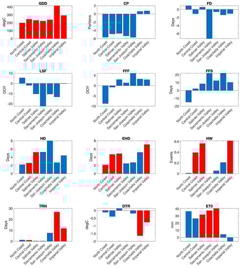 In California, where the Mediterranean-type climate and extensive water infrastructure have allowed for the cultivation of a wide variety of crops, agriculture is a >$50 billion industry. California produces forage, fiber, livestock, aquaculture, grains, and dairy, but is perhaps best known for its production of high-value specialty crops, including more than ⅓ of U.S.-grown vegetables and more than ⅔ of U.S.-grown fruits and nuts, by volume [11]. Although producer selection of crop type and variety results from a range of historical, cultural, and economic factors (e.g., [12]), climate is a primary driver of crop distribution and yield potential [13,14]. Even in highly managed agricultural systems where damage from adverse weather can be mitigated, understanding the expected conditions based on climatology can provide producers with valuable information for farm management planning (e.g., [15]). Although the climate metrics from NCEI and ETCCDI provide some utility for understanding agriculture–climate relationships, and while some of these metrics are agriculturally-relevant (e.g., ETCCDI’s number of frost days, growing degree days), there are additional climate metrics that are of interest to the agricultural community. Metrics that offer a snapshot of physiologically relevant environmental conditions and provide support for in-season decision making may be of particular importance [16], and trends in agroclimate metrics can be more useful than standard climate metrics for identifying and enacting strategies for resilient crop production and agricultural adaptation [17,18]. Likewise, there may be some advantage in communicating observed and projected climate change in terms of agriculturally relevant metrics, which presumably have more contextual meaning for agricultural producers than more widely available precipitation and temperature summaries [17].