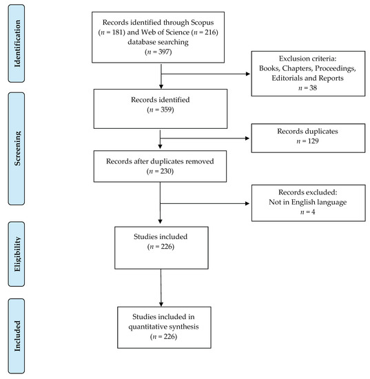 In the first phase of Identification (Figure 1), the search for keywords initially produced a total result of 397 records, of which 181 were identified through Scopus and 216 through the Web of Science database. The next phase for the selection of the relevant literature took place through the Screening and Eligibility [2,44,46,47]. In the Screening phase, applying the primary exclusion criteria—in this bibliographic search phase, only academic articles published in indexed journals were included—the selected articles identified by Web of Science and Scopus were reduced from 397 to 359 records. Only articles and reviews were considered for research purposes; 38 records were eliminated in this phase, including Books, Chapters, Proceedings, Editorials and Reports. Subsequently, in the Eligibility phase, the duplicates of the articles that came from both databases were eliminated, and therefore the number of articles for this study was reduced from 359 to 230, thus excluding 129 duplicate records. In order to consider the literature as highly visible within the scientific community, 4 non-English articles were excluded during the subsequent Eligibility phase [2,4,44]. In the last phase of the Included stage, a sample of 226 documents was selected to answer our research question.