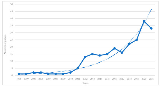 The Figure 2 shows the development of academic literature in the period 1996–2021, taking into consideration the number of articles per year. Generally, before 2011, there were fewer than five papers per year. Since 2012, the trend has always been constantly growing.