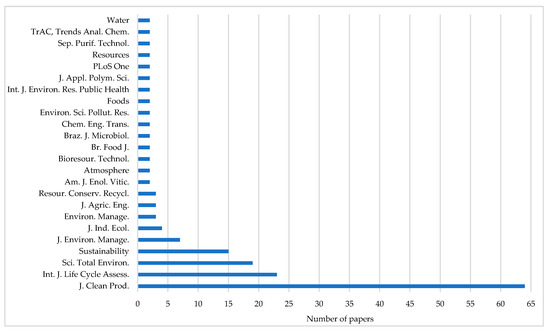 In Figure 3, journals containing at least two papers are represented. Most of the papers are published in the Journal of Cleaner Production with 64 total articles, followed by the International Journal of Life Cycle Assessment with 23 articles and Science of the Total Environment with 19 articles, Sustainability with 15 papers, the Journal of Environmental Management (7) and the Journal of Industrial Ecology (4). All other journals achieved lower values, as mentioned in Figure 3.
