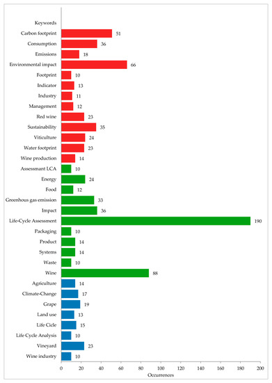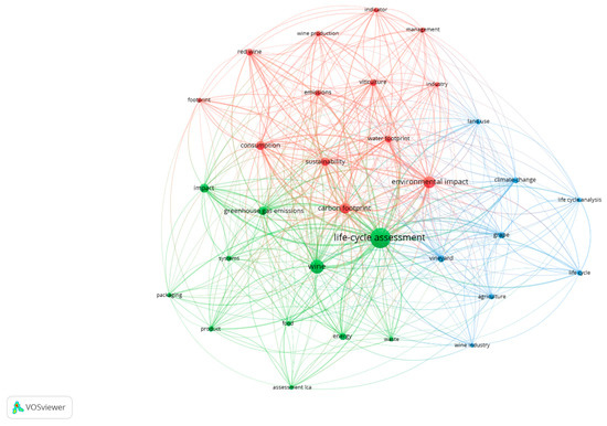 The literature published on the measurement of the environmental impacts of the wine production chain using LCA methodologies includes the following three aspects: wine industry (red), agricultural phase (blue) and winemaking phase (green). Through the analysis of keywords and the analysis of their recurrence, it was possible to identify three clusters of main research topics (Figure 5).