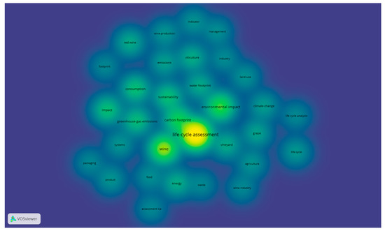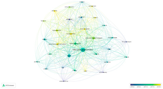The keywords that have appeared the most and with stronger interconnected links are “life-cycle assessment” (total connection strength 633), “environmental impact” (total connection strength 302) and “vineyard” (total connection strength 302), which had a strong link with “carbon footprint” and “wine”.