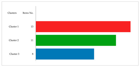In this study, the keywords in the title and abstract of selected papers were included in the final analysis. Three main clusters have been created, which means groups of themes. The first cluster was designated by the red colour and covered 13 elements. The second cluster was expressed by the green colour and involved 11 elements. The third cluster includes 8 elements in blue, as shown in Figure 5.