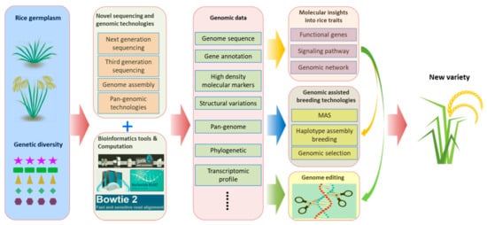 Sequencing and genomic technologies advancement provided many tools and methods which can incorporate into and accelerate the conventional breeding process. These tools and methods also revolutionized the landscape and schemes of rice breeding, and led to a new concept, ‘genomics-assisted breeding’ [].