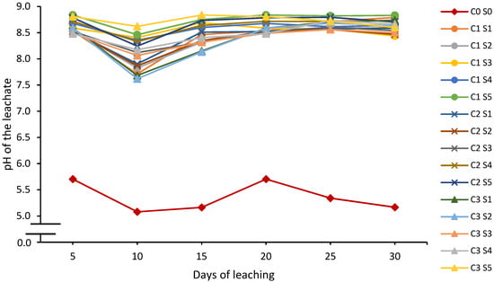 The effects of the Calciprill and sodium silicate on the EC of the leachates over 30 days of leaching are shown in Figure 2. The soil without any amendments (C0S0) resulted in the lowest EC throughout the leaching study with an increase from 0.023 dS m−1 on day 5 to 0.052 dS m−1 on day 10 and a decrease to 0.036 dS m−1 on day 15, followed by slight increments on day 20 (0.026 dS m−1), day 25 (0.029 dS m−1), and day 30 (0.035 dS m−1). The lowest EC was due to the low saturation of base cations because this soil is made up of highly weathered ferric oxide which forms kaolinite clay minerals that are poor in nutrient holding and prone to nutrient leaching. This low number of base cations in the soil without any amendments (C0S0) is the result of losses through leaching during high rainfall as simulated in this experiment. The Calciprill and sodium silicate increased the soil EC due to the dissolution of these amendments which released base cations such as K+, Ca2+, Mg2+, and Na+ into the soil solution. Furthermore, the EC of the leachates decreased with the increase in leaching time, suggesting that the continued leaching removed some of the soluble salts from the soils over time. It is noteworthy that, with the same amount of Calciprill (C1, C2, and C3), the EC of the leachates with the highest rate of sodium silicate (S5) was higher than those with lower rates of sodium silicate, indicating that the sodium silicate influences soil EC significantly due to its high Na+ content. This finding is comparable with that of Cramer [58] who reported that the higher charge density and ionic radius of Ca2+ (0.099 nm) compared with Na+ (0.097 nm) resulted in its stronger electrostatic attraction with CO32− ions, thus Na+ revealed a stronger influence on the EC of the leachates. However, the EC of the leachates did not exceed the saline threshold of 4.0 dS m−1, which implies that the soil solutions in this study will not cause salinity problems in crop cultivation [59].