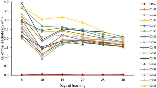 Electrical conductivity of leachates for the different treatments over 30 days of leaching.