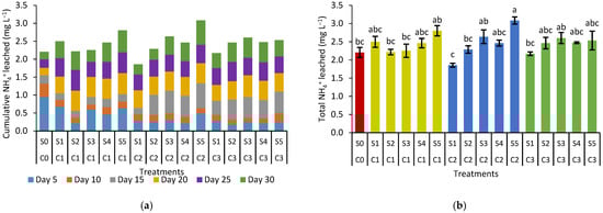 The effects of the co-application of Calciprill and sodium silicate on the cumulative concentrations of NH4+ leached over 30 days are presented in Figure 3a. The amount of NH4+ leached was highest for the soil without any amendments (C0S0) on day 5 but gradually decreased towards the end of the leaching study. In other words, the Calciprill and sodium silicate reduced the leaching of NH4+ by amounts ranging from 28.4% to 85.2% on day 5 of leaching. The amount of NH4+ leached from the soils with the amendments gradually increased towards the end of the leaching study. It was observed that the total NH4+ leached from the soils with Calciprill and sodium silicate in C2S5 (3.36 mg L−1) was higher than that for C0S0 (2.41 mg L−1) (Figure 3b). This suggests that Calciprill and sodium silicate significantly improved NH4+ in the soil solution because of the significant increase in soil pH. This finding is comparable with that of Binkley et al. [60] who reported that an increased soil pH facilitates the transformation of organic N into NH4+ in a soil solution via improved mineralization.