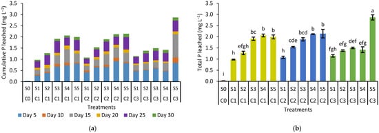 (a) Cumulative phosphorus in leachates at five day intervals and (b) total phosphorus in leachates for the different treatments after thirty days of leaching. Different letters indicate significant mean differences using Tukey’s HSD test at p ≤ 0.05. Error bars represent the standard error of the mean.