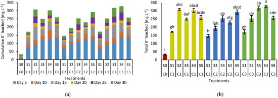 (a) Cumulative potassium in leachates at five day intervals and (b) total potassium in leachates for the different treatments after thirty days of leaching. Different letters indicate significant mean differences using Tukey’s HSD test at p ≤ 0.05. Error bars represent the standard error of the mean.