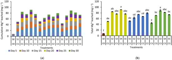 (a) Cumulative magnesium in leachates at five-day intervals and (b) total magnesium in leachates for the different treatments after thirty days of leaching. Different letters indicate significant mean differences using Tukey’s HSD test at p ≤ 0.05. Error bars represent the standard error of the mean.