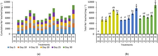 (a) Cumulative sodium in leachates at five day intervals and (b) total sodium in leachates for the different treatments after thirty days of leaching. Different letters indicate significant mean differences using Tukey’s HSD test at p ≤ 0.05. Error bars represent the standard error of the mean.