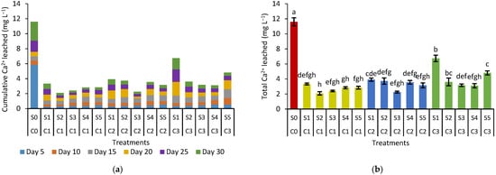 (a) Cumulative calcium in leachates at five day intervals and (b) total calcium in leachates for the different treatments after thirty days of leaching. Different letters indicate significant mean differences using Tukey’s HSD test at p ≤ 0.05. Error bars represent the standard error of the mean.