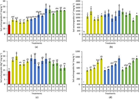 Soil exchangeable (a) potassium, (b) calcium, (c) magnesium, and (d) sodium for the different treatments after thirty days of leaching. Different letters indicate significant mean differences using Tukey’s HSD test at p ≤ 0.05. Error bars represent the standard error of the mean.