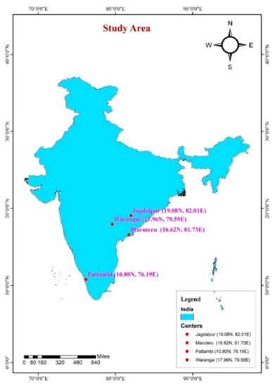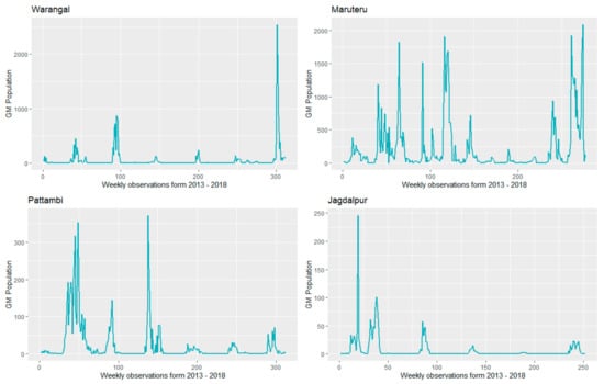 The Chinsurah type light trap with a 200-watt bulb was used in the study because it is successfully used in monitoring of rice gall midge and other insect pests in rice ecosystems throughout the year [,]. The bulb was illuminated daily from 6:00 pm to 6:00 am. In the morning, the collected rice gall midges were brought to the laboratory and the number of individuals caught per day were manually counted, summed and presented as weekly cumulative catches []. If the insect catches were too large, the population was divided into different equal subgroups, one subgroup was counted and then multiplied with the remaining number of subgroups. Data were collected at four hot spot locations in India: Warangal, Maruteru, Pattambi and Jagdalpur (Figure 2). Corresponding climatological data on maximum temperature (MAXT), minimum temperature (MINT), total rainfall (RF), morning relative humidity (RHM), evening relative humidity (RHE) and sunshine hours (SSH) were also collected from automatic weather stations at the respective locations. Standard meteorological week (SMW)-wise cumulative catches of gall midge and weekly averages of climatological parameters were considered for this study. Six-week observations were used as testing/validation sets, and remaining observations were used as the training data set.