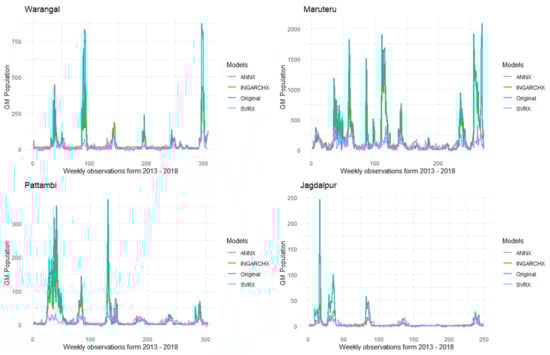 The results of modeling and predictions of the gall midge population at examined study sites obtained by employing different models were compared in terms of MSE and RMSE in both training and testing datasets, and are presented in Table 6. In this study, the fitness of the stepwise regression model was found to be weak (low R2) due to non-linearity and high heterogeneity in the dependent variable. However, Samui et al. (2004) [] found a strong relationship between temperature, relative humidity, rainfall and sunshine hours on the development of gall midges in successive generations using stepwise regression. Amongst the attempted techniques, the ANNX model superiorly outperformed the INGARCHX and SVRX models in both training and testing data sets, as revealed by the low MSE and RMSE values. Furthermore, the INGARCHX model performed better compared to the SVRX model in both training and testing data sets. Performance hierarchy of these models is as follows: ANNX > INGARCHX > SVRX in both training and validation sets at all four locations. Similar results were obtained in [,,], where the ANN model outperformed the classical autoregressive integrated moving average and SVR models.