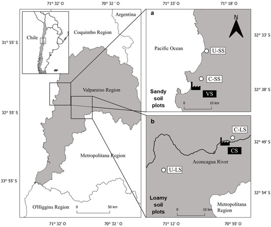 Our research was assessed in two contrasting areas from the Valparaíso region in central Chile (Figure 1). The first area is the Puchuncaví Valley, where the VS is located (Figure 1a) and is characterized by a coastal area with predominantly sandy soils. The second area is in Catemu, where the CS is (Figure 1b) located near the Aconcagua River with predominantly loamy soils.