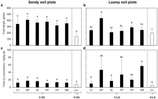 Fresh weight of lettuces at harvest time and the corresponding copper concentration in their edible tissues (on a dry weight basis): (a,c) are the results of lettuces grown on sandy soils, while (b,d) are those for lettuce grown on loamy soils. Bars are means ± SD (n = 5). Different letters above the means indicate significant differences between treatments based on Tukey multiple comparison test (p ≤ 0.05). Black bars represent contaminated soil under different treatments: C+ = Contaminated soil without amendment; DP = diammonium phosphate; FP = ferrous phosphate; IS = iron sulfate; OM = organic matter addition; CP= calcium peroxide. White bar represents uncontaminated soil: C− = Uncontaminated soil without amendment. C-SS = Contaminated sandy soil plot; U-SS = Uncontaminated sandy soil plot; C-LS = contaminated loamy soil plot; and U-LS = Uncontaminated loamy soil plot.