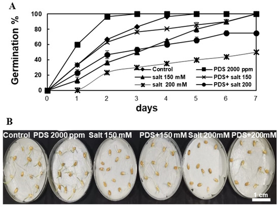 Effect of PDS on germination rate of wheat under normal and salt stress conditions. (A) Wheat seeds were subjected to PDS 2000 ppm, salt 150 and 200 mM and PDS + salt treatments (150 + 2000 ppm and 200 + 2000 ppm). Germination rate was observed at day 1–7. PDS 2000 ppm accelerated germination rate and alleviated the salt stress (150 and 200 mM) (Figure 1A). X-axes represent number of days. (B) Photographs were taken at day 2 (48 h). All data were analyzed using one-way ANOVA, with multiple comparisons using LSD test at a significance threshold of p ≤ 0.05 (n = 10). Each independent experiment was repeated three times.